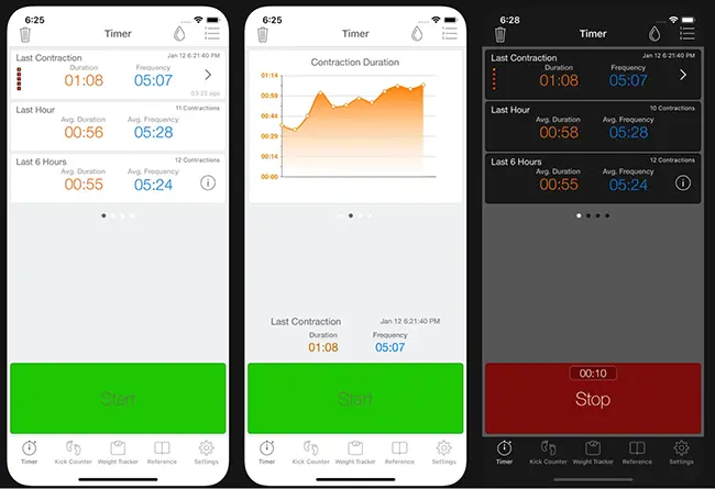 Contraction Timer & Tracker is modern and beautifully straightforward. Created by developer James Ots, this one focuses on pure functionality — large buttons, clear stats, and a dark mode that’s perfect for night labor.